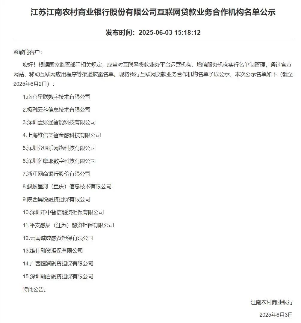 比如,江苏江南农商行此次披露的合作名单共15家机构,包括壹账通、萨摩耶数科、分期乐、网商银行等平台,以及7家融资担保公司。