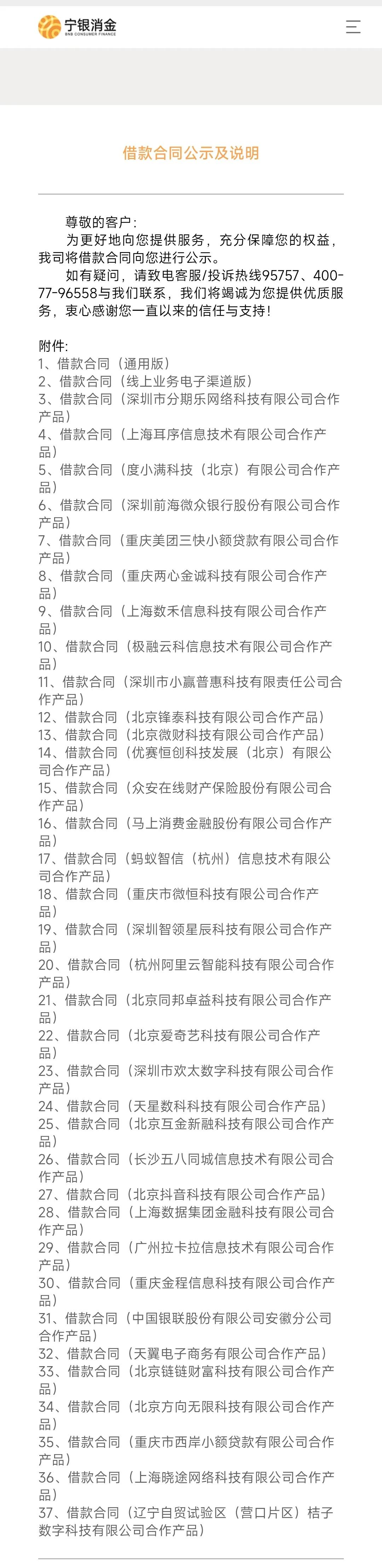 宁银消金官网以合同范本的形式公布了合作助贷产品名单。除了通用版和线上业务渠道版,宁银消金共合作35款助贷产品。这其中包括分期乐、度小满、微众银行、美团等众多知名机构。
