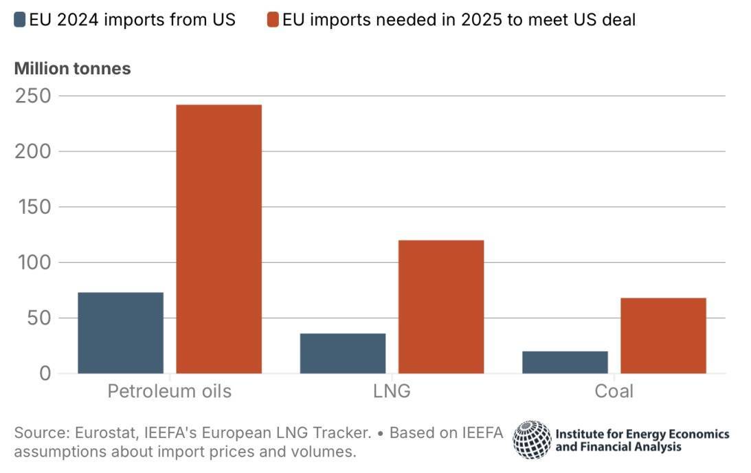 rrrr欧洲能源经济学和金融分析研究所首席研究员贾勒-马卡雷维奇指出,欧盟三年内从美采购7500亿美元能源“不现实”。该机构估算,若要达标,2025年欧盟自美进口石油、煤炭和液化天然气需同比激增3倍——这既难以实现,也将导致欧盟过度依赖单一供应国。
